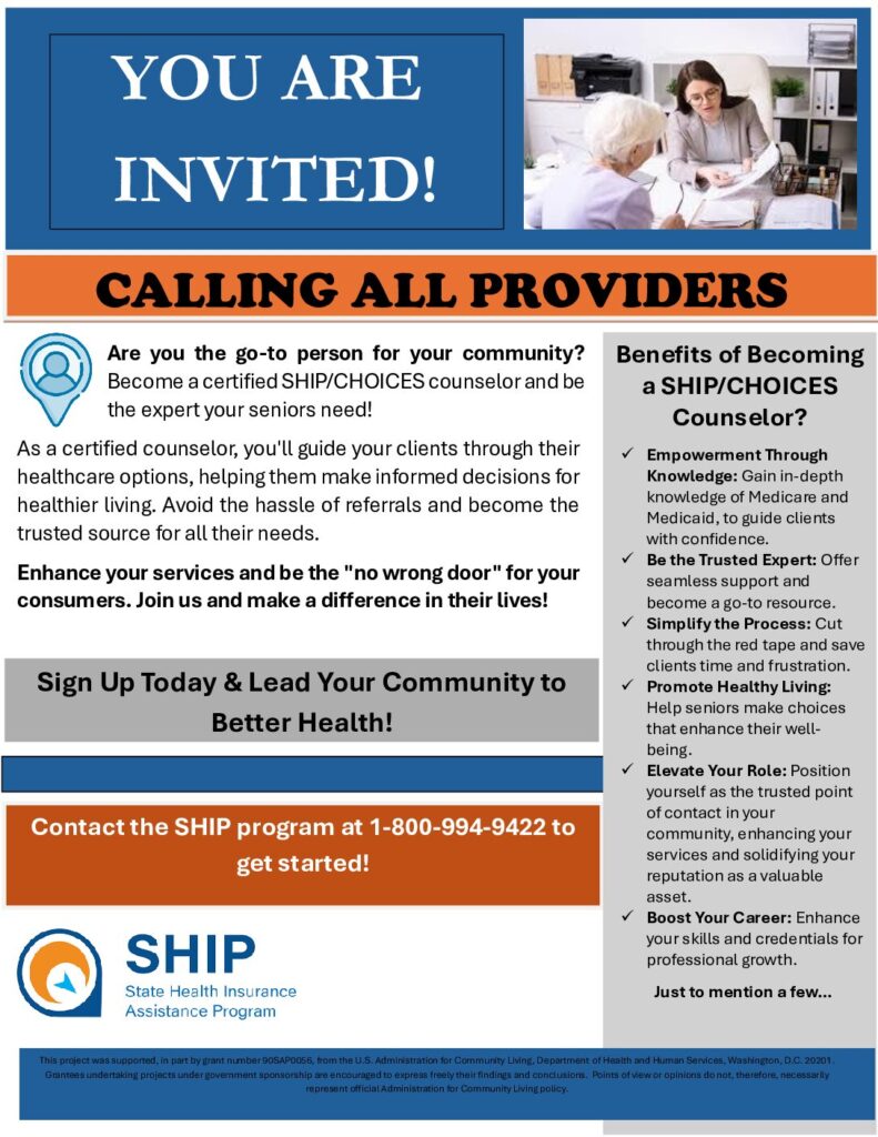 Individuals who would like to make a positive difference in the lives of Medicare beneficiaries. Interested applicants should have a variety of skills including listening, computer, internet skills, etc. CHOICES volunteer roles include Administrative Support, Counselor, Open Enrollment Counselor, Outreach Volunteer, and Presenter. Certification requirements include: agreeing to adhere to CHOICES Volunteer Risk & Program Management (VRPM) policies and procedures; passing CHOICES exams; signing the CHOICES Memorandum of Understanding; attending CHOICES Update trainings; and reporting SHIP related performance activities.